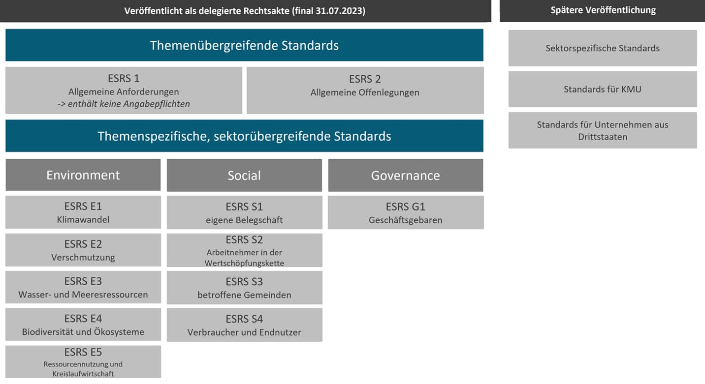 ESRS ist die Abkürzung für European Sustainability Reporting Standards, unter denen die EU-Standards für die Nachhaltigkeitserklärung zu verstehen sind und die die drei ESG-Themenbereiche, Environmental, Social und Governance, abdecken. Diese Standards oder konkreten Berichtsanforderungen, welche von der European Financial Reporting Advisory Group (EFRAG) entwickelt wurden und welche die EU-Kommission am 31.7.2023 als delegierten Rechtsakt veröffentlicht hat, haben alle Unternehmen anzuwenden, die der Richtlinie zur Nachhaltigkeitsberichterstattung von Unternehmen (CSRD) unterliegen.